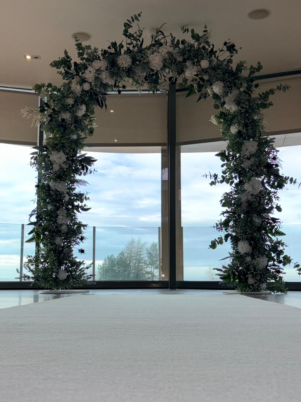 This arch can have colours incorperated throughout to match your colourscheme.Matching floral pieces available.