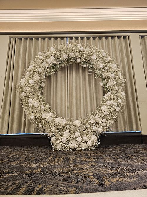 Grace is a breathtaking, double-sided moongate arch that radiates timeless elegance and soft romance. Designed in a full, circular silhouette, it is lavishly filled with pristine white roses nestled among clouds of delicate white gypsophila, creating a beautifully textured and ethereal look from every angle.